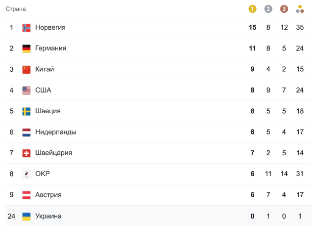 У медальному заліку впевнено лідирує Норвегія, яка ще до кінця олімпіади стала переможцем. Норвезькі спортсмени вже недосяжні для Німеччини та інших країн.