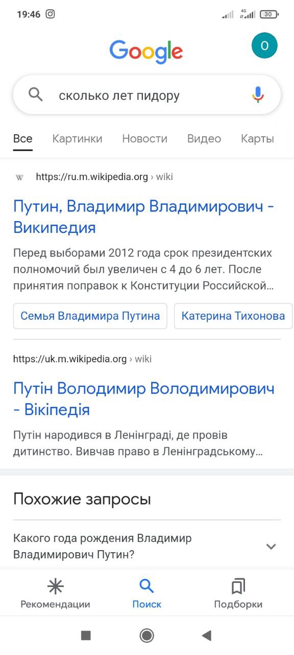 Варто зазначити, що запит працює лише російською мовою. Якщо запитати "Скільки років п*дору" українською - з'являється зовсім інший результат.