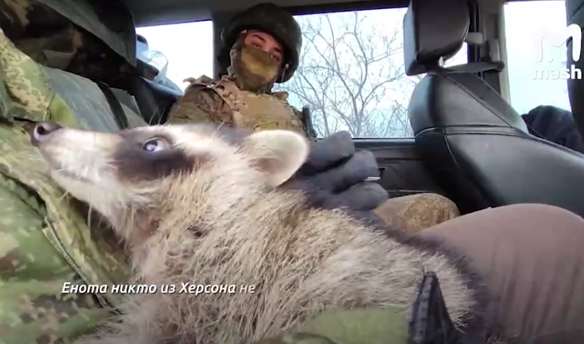 За словами росіян, єнот живе у них у підрозділі, харчується виноградом, рибою та горіхами. Тварина часто влаштовує нічні диверсії – громить окупантам бунгало.