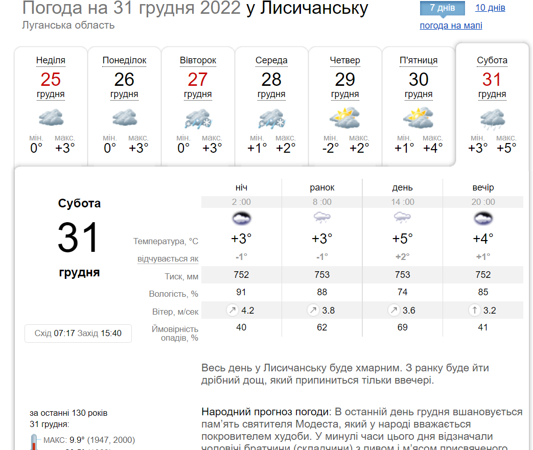 Останній тиждень 2022 року в Лисичанську буде нетипово теплим, про що свідчить прогноз погоди від sinoptik.ua , повідомляє Час Пік.