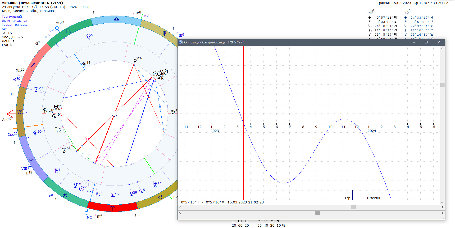 "7 березня 2023 р. Сатурн вийшов з Водолія і перейшов до Риб. Він вийшов зі з'єднання з Місяцем карти України, що говорить про закінчення цього важкого періоду для звичайних людей (але не військових). Період евакуацій, масових смертей мирних громадян, поневірянь та труднощів, загрози голоду, великих територіальних втрат - добіг кінця, але оскільки в карті України Місяць та Сонце перебувають в опозиції (це спочатку закладена суперечність та боротьба між народом і владою в Україні), то тепер, з березня 2023 року, Сатурн вступив в опозицію з Сонцем. Найбільше цей аспект буде проявлятися в межах орба в 1 градус. Це з 7 березня до 24 березня, і з 23 вересня по 15 грудня 2023 р. Але повністю цей аспект розпадеться лише в лютому 2024 року", - пише астролог. .