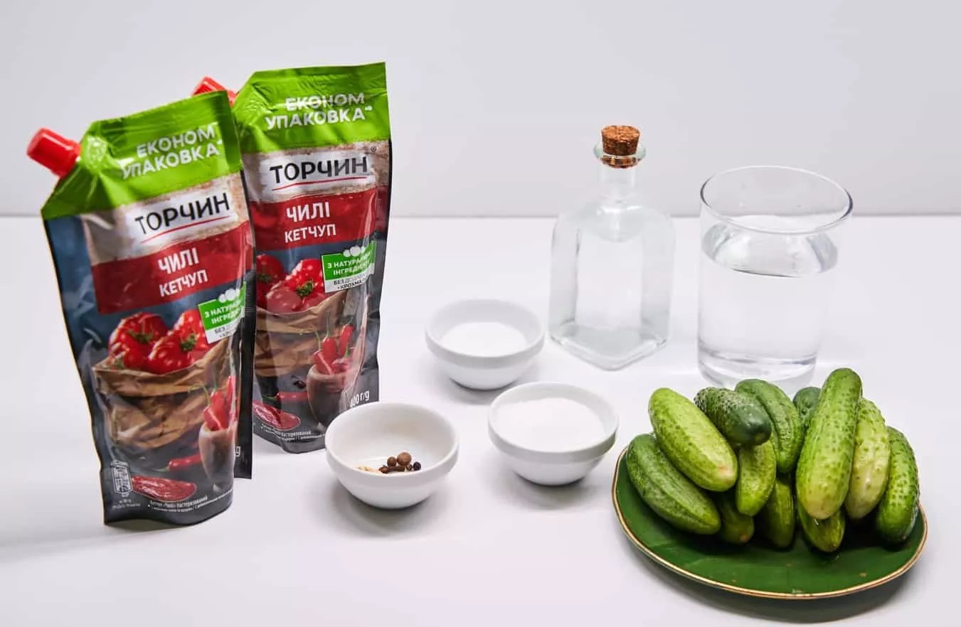 Щоб приготувати огірки з кетчупом чилі від “Торчин” нам знадобиться найпростіший набір інгредієнтів. На 5 літрових банок беремо: