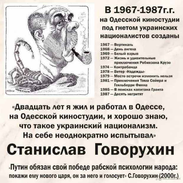 «Говорухин заявил:«20 лет я жил и работал в Одессе, на Одесской киностудии, и хорошо знаю, что такое украинский национализм. На себе неоднократно испытывал». Вот мы и решили увековечить его память, перечислив его знаменитые фильмы, снятые в Одессе, как он утверждает, под «националистическим гнетом», - сказала Балаба.
