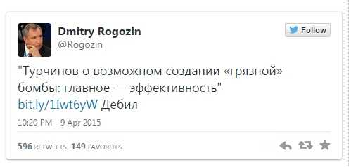 Вице-премьер-министр РФ Дмитрий Рогозин назвал секретаря Совета национальной безопасности и обороны Украины Александра Турчинова «дебилом» в ответ на его заявление о возможности создания в Украине «грязной» атомной бомбы. Такое высказывание российский политик допустил в своем Твиттере.