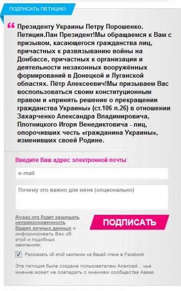 Жители Украины начали сбор петиций на лишение гражданства лидеров самопровозглашенных ДНР и ЛНР - Александра Захарченко и Игоря Плотницкого. На сайте петиций AVAAZ.org было зарегистрировано обращение к президенту Украины Петру Порошенко.