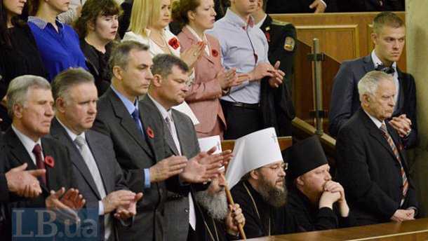 После этого в сессионном зале Рады прозвучали громкие аплодисменты, и даже иностранные гости встали с мест, однако представители московской церкви в Украине не изъявили желание чествовать защитников государства.