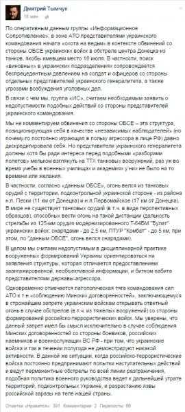 По оперативным данным группы «Информационное Сопротивление», в зоне АТО представителями украинского командования начата «охота на ведьм» в контексте обвинений со стороны ОБСЕ украинских войск в обстреле центра Донецка из танков, якобы имевшем место 18 июля. В частности, поиск «виновных» в украинских подразделениях сопровождается беспрецедентным давлением на солдат и офицеров со стороны отдельных представителей украинского генералитета, а также угрозами возбуждения уголовных дел. Об этом на своей странице в Фейсбуке написал координатор группы "Информационное сопротивление" Дмитрий Тымчук.