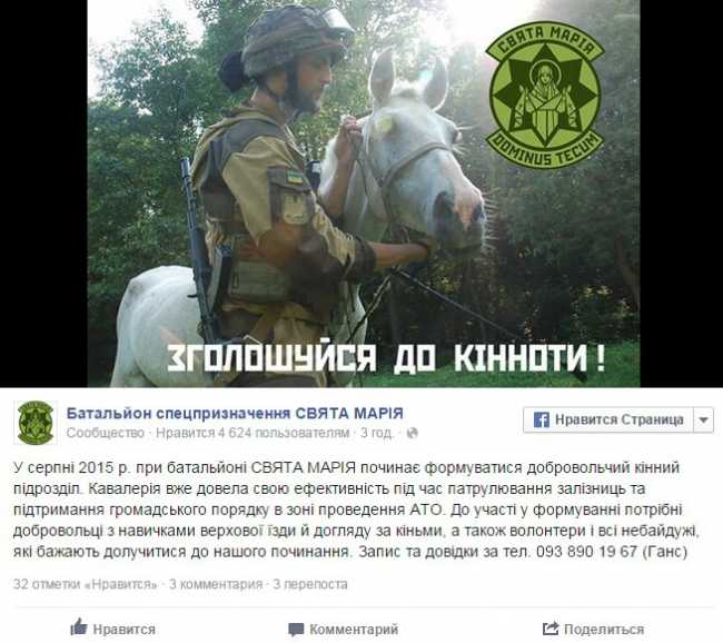 В августе 2015 года в Украине появится кавалерия, о чем на своей странице в «Фейсбуке» сообщают представители украинского батальона спецназначения «Святая Мария».