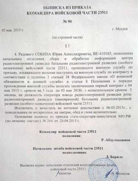 Вышеупомянутый военный находится на службе по контракту на должности оператора взвода радиоэлектронной разведки военной части 23511. Соответствующая информация указана в опубликованном им приказе. В выписке из приказа даже указан номер личного жетона Собина - ВЕ-410165.