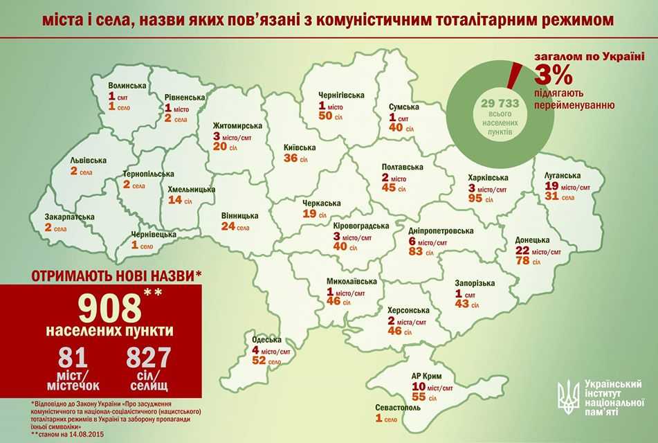 Всего в списке на переименование фигурирует 908 населенных пунктов, из них - 30 городов и 51 пгт, 711 сел и 116 поселков. Таким образом, за последний месяц список увеличился на 30 городов и сел. Прогнозируется, что их количество может достигнуть тысячи.