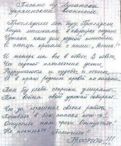На одном из блокпостов Луганской области женщина передала блогеру Елене Степовой письмо из оккупированного Луганска. Адресовано оно украинским военным и пронизано невероятной болью.