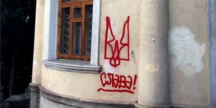 Дом украшает герб Украины и надпись «Слава!». Все выполнено красной краской.