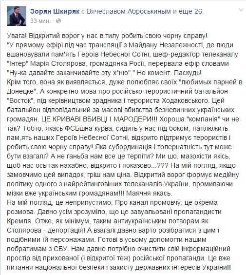 "Кроме того, она (Мария Столярова, - ред.), как оказывается, очень любит своих "любимых парней в Донецке". А конкретно речь о российско-террористическом батальоне "Восток", под руководством предателя и террориста Ходаковского. Этот батальон ответственен за массовые убийства невинных украинских граждан. ЭТО КРОВАВЫЕ УБИЙЦЫ И МАРОДЕРЫ!!! Хорошая "компания" или не так? То есть, какая-то ФСБшная курва, сидит у нас под боком, порочит память, память наших Героев Небесной Сотни, открыто поддерживает террористов и делает свое черное дело! Какова субординация и толернатность здесь может быть вообще? А не позор ли нам все это терпеть? Мы что, мазохисты какие-то, чтобы нас вот так нагло, открыто и показательно...??? На мой взгляд, если промолчим этот случай, грош нам цена. Открытый враг формирует медийную политику одного из самых рейтинговых телеканалов Украины, промывая мозги уже украинским гражданам!!! Бред какой-то", - написал Шкиряк.