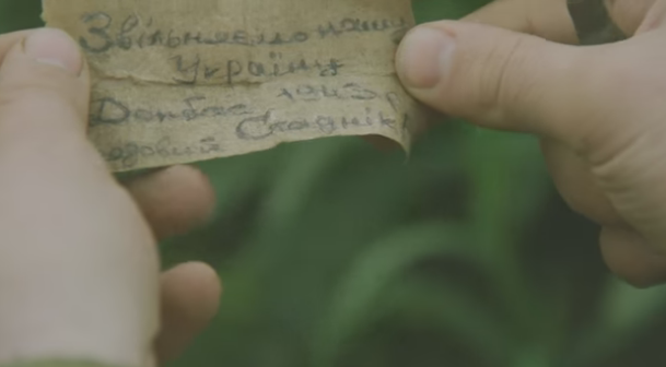 На видеозаписи украинский военный на Донбассе обнаруживает в окопе патрон, в гильзе которого оказывается короткая записка на украинском языке. Ее текст гласит: «Освобождаем нашу Украину. Донбасс. 1943 год. Рядовой Стадник».
