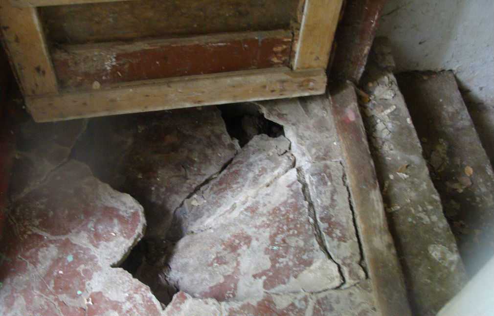 От пола в тамбуре продолжают откалываться куски каменной глыбы и падать в подвал.