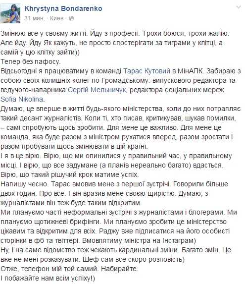Известная украинская журналистка Кристина Бондаренко распрощалась с "Громадським ТВ" и решила сменить тележурналистику на работу в Министерстве аграрной политики Украины.