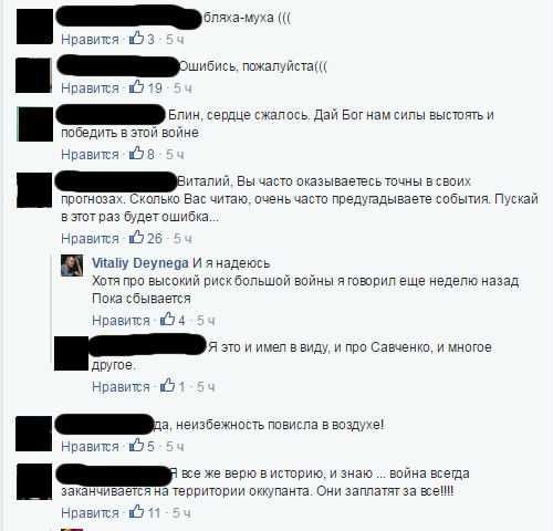 "Судя по всему, нас ожидает еще одна война. С реками крови с российскими ракетами и ударами обеих сторон по заведомо разведанным местам. Мы не столь решительны. И в этом наша слабость. Они ударят первыми и мы будем огрызаться уже тем что осталось. И это будет конец этой войны. В которой мы по итогу победим, умывшись своей же кровью и отправив в обратном направлении тысячи "зеленых человечков". Кто бы что ни говорил о нас, но в ближайшие дни могут заговорить уже наши "Точки-У" и российские крылатые ракеты. И результат не предскажет сейчас никто. Мы помогали армии, мы собирали свои силы в кулак именно для этого момента. Все сделано. Осталось только наблюдать.
