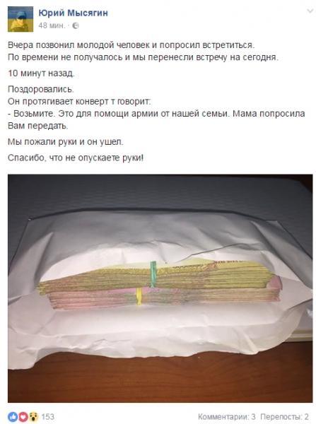Пока "слуги народа" декларируют свои богатства, обычные люди собирают деньги, чтобы передать их украинским военнослужащим. Об одном из таких эпизодов рассказал у себя в Фейсбуке волонтер Юрий Мысягин.
