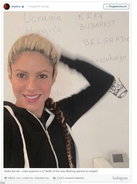 На своїх сторінках в соцмережах Шакіра опублікувала фото, де вона позує на фоні дошки з написаними від руки назвами країн та міст.
