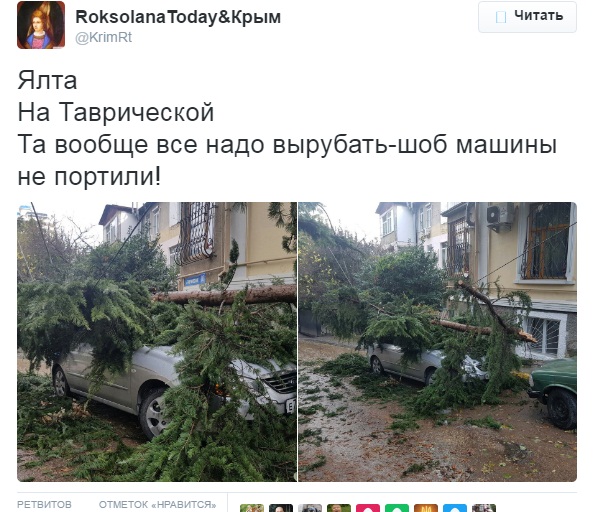 Жители полуострова рассказывают, что в городах от поваленных деревьев раздавлены машины, тяжелые погодные условия испортили выходные крымчанам. "Масла в огонь" подлил сильный снег, который порой переходил в не менее сильный дождь.
