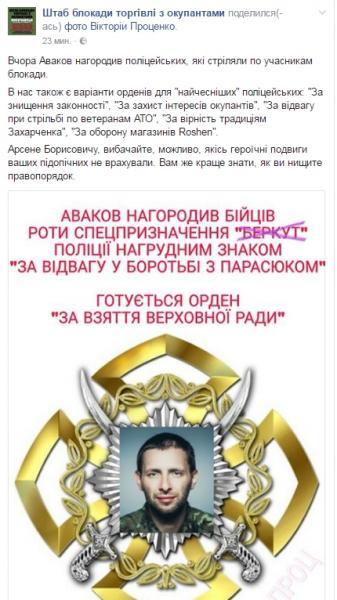 "Вчера Аваков наградил полицейских, которые стреляли по участникам блокады.