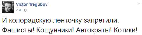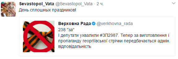 «Ура! ВР запретила георгиевскую ленту. Теперь за ношение символа оккупанта и агрессора полагается штраф! Спустя три года, просьбы сотен тысяч граждан Украины были услышаны», - написал в Фейсбуке известный волонтер Семен Кабакаев.