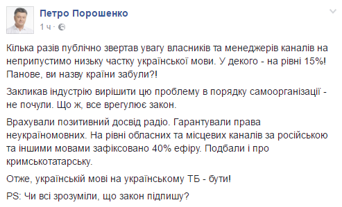 В своей сегодняшней публикации в Фейсбуке президент подчеркнул, что уже не раз пытался достучаться к руководителям телеканалов с просьбой увеличить количество украинского контента, но все усилия оказались тщетными. Поэтому проблему пришлось решать законодательно.