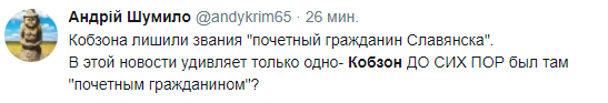 Кобзон был почетным гражданином Славянска с 1999 года. Инициатива снять с него эту регалию принадлежит местным общественным активистам и выдвигалась еще три года назад, после освобождения Славянска от НВФ, но в 2015-м горсовет не стал выносить этот вопрос на голосование.