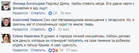 «Я думаю, в порядке личной инициативы, Кобзон должен все деньги, которые он планирует потратить на свое лечение за рубежом, отдать в пользу Крыма. А сам- сдохнуть», - написали пользователи.