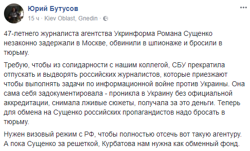 По мнению журналиста Юрия Бутусова, российских пропагандистов не стоит выдворять из Украины, а вместо этого обменивать их на наших журналистов, которых незаконно удерживают в РФ.