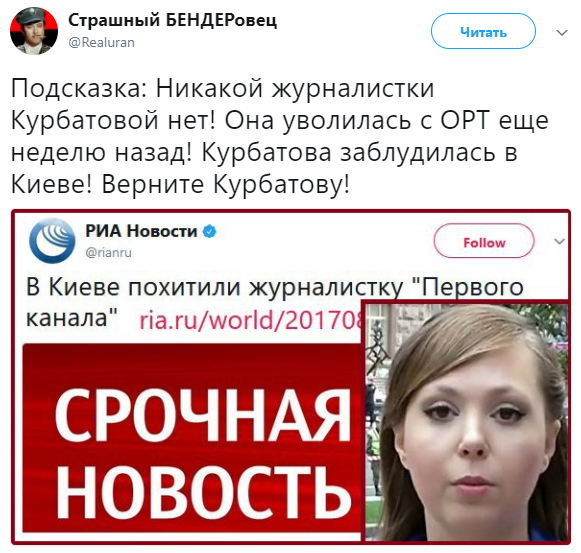 Другие написали, что Курбатова просто «заблудилась» в Киеве и вообще уволилась с ТВ еще неделю назад.