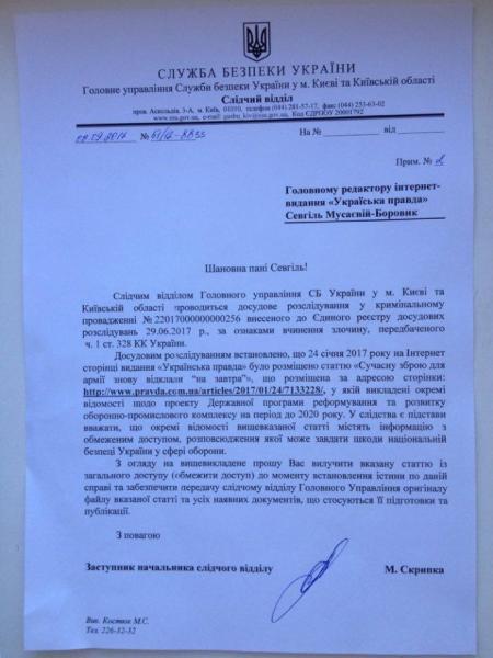 СБУ просит изъять вышеупомянутую статью из публичного доступа на время расследования, а также предоставить документы, связанные с ее подготовкой и публикацией.