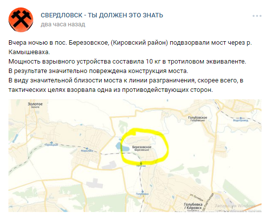 "Вчера ночью в пос. Березовское, (Кировский район) подвзорвали мост через р. Камышеваха.