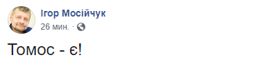О получении Томоса также сообщил народный депутат Игорь Мосийчук.