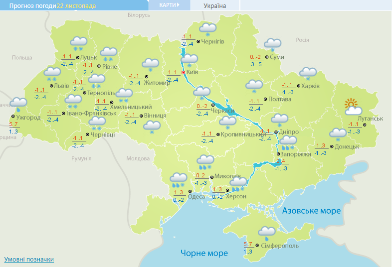 В среду, 21 ноября, осадки ожидаются практически по всей Украине, лишь на Лугащине будет облачно с прояснениями. На Закарпатье и в Крыму возможен дождь, в южных областях - дождь со снегом, в остальных регионах - снег. Температура в большинстве областей днем от -1 до +1, ночью -2...-4 градуса.