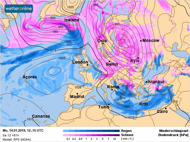 "Эта веселая, почти по Ван-Гогу, картинка, только розовое на желтое поменять - прогностическая карта осадков на 14 января, на Василия.
