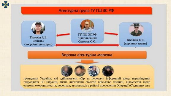 Службой также установлено, что для непосредственного сбора разведывательной информации с подконтрольной украинской власти территории кураторами из РФ была задействована агентурная сеть военной разведки Российской Федерации в составе четырех человек. Сеть использовали сотрудники военной разведки РФ Александр Сазонов и завербованный резидент Андрей Тимохин. Для конспирации при передаче разведданных относительно военной техники украинских Вооруженных Сил, ее количества, маршрутов передвижения и мест дислокации вражеских агентов, следуя инструкциям, использовали специальную терминологию и условности.
