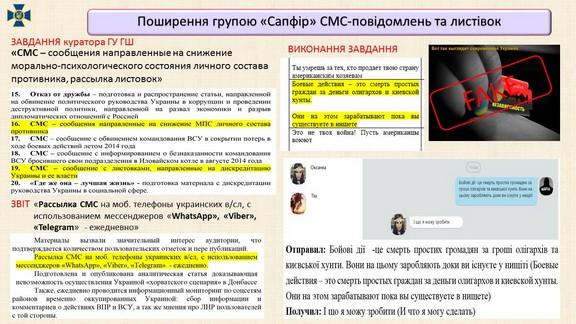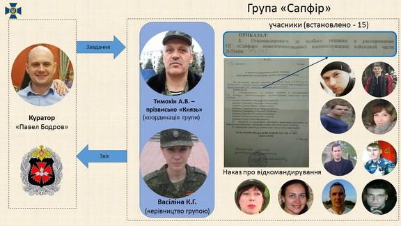 Оперативники спецслужбы задокументировали, что группа под кодовым названием «Сапфир» по заданию российских кураторов организовывала подготовку и проведение антиукраинских информационных кампаний. Участники группы также занимались сбором и анализом информации о высшем руководстве Украины, Вооруженных Сил и других воинских формирований, сбором разведывательной информации о силах и средствах, задействованных в операции объединенных сил. «Мы зафиксировали существенный рост активности этой группы накануне выборов Президента Украины», - отметил Сергей Левченко.