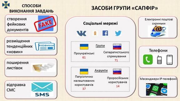 Поставленные российской разведкой задачи группа выполняла с помощью специально зарегистрированных в соцсетях страниц как проукраинского так и сепаратистского толка, создав в общей сложности более пятидесяти аккаунтов и сто тридцать групп в соцсетях. Для распространения фейковых сообщений злоумышленники использовали специально разработанные сайты, задействовали мессенджеры IP-телефонии и электронные почтовые ящики. «Злоумышленники также рассылали открытки и СМС-сообщения провокационного содержания украинским военным», - подчеркнул представитель СБУ.