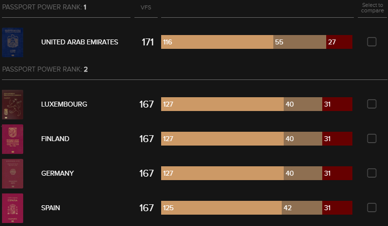 Первое место по-прежнему занимают Объединенные Арабские Эмираты, для граждан которых открыта 171 страна. На втором месте расположились Люксембург, Финляндия, Германия и Испания.