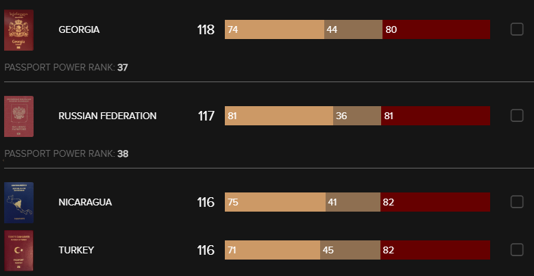 Российская Федерация занимает в рейтинге паспортов 37-ю строчку. Граждане РФ могут свободно посетить 117 стран: 81 без визы и 36 с визой по прибытию.