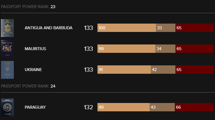 По сравнению с прошлым годом, Украина поднялась в рейтинге паспортов на 5 позиций.