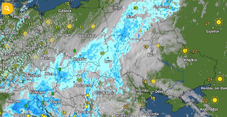 На Западе ожидается самая низкая температура воздуха, +7 +12 градусов, в Карпатах +1 +6 градусов, на высокогорье возможен мокрый снег.