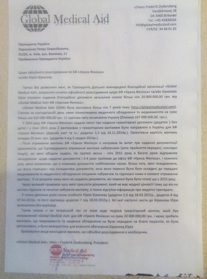 "Я по сегодняшний день не знаю, куда делся гуманитарный груз, направленный Global Medical Aid в "Крила Фенікса" и могу сделать вывод, что медикаменты и медицинское оборудование не было передано на благо пациентов, как было запланировано, а было использовано для обогащения Юрия Бирюкова", - отметил в письме глава Global Medical Aid Фредерик Диденсборг.