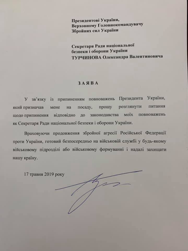 «В связи с прекращением полномочий Президента Украины, который назначал меня на должность, прошу рассмотреть вопрос о прекращении в соответствии с законодательством моих полномочий как Секретаря Совета национальной безопасности и обороны Украины.