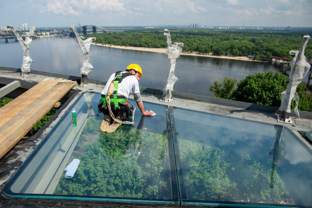 В воскресенье, 19 мая, мэр Киева Виталий Кличко проверил стеклянные панели в полу нового пешеходно-велосипедного моста между парками Крещатый и Владимирская горка на прочность.