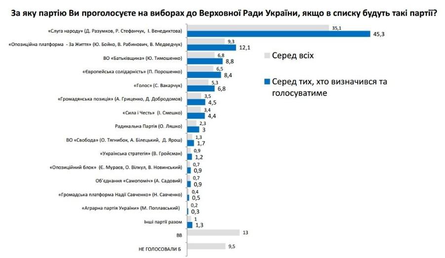 За партию "Слуга народа" готовы проголосовать 45,3% респондентов тех, кто определился с выбором и будет принимать участие в голосовании. За "Оппозиционную платформу - За життя" готовы проголосовать 12,1% опрошенных (по данным предыдущего опроса - 10,3%), за ВО "Батьківщина" - 8,8% (по данным опроса от 20 июня - 9% ), за "Европейскую солидарность" - 8,4% (по данным от 20 июня - 8,7% ), партию "Голос" - 6,8% респондентов (ранее - 5,9%).