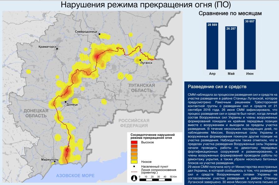 Больше всего нарушений прекращения огня зафиксировано в июне - 30657. Также отмечается, что во втором квартале такие нарушения были состредоточены в четырех точках: