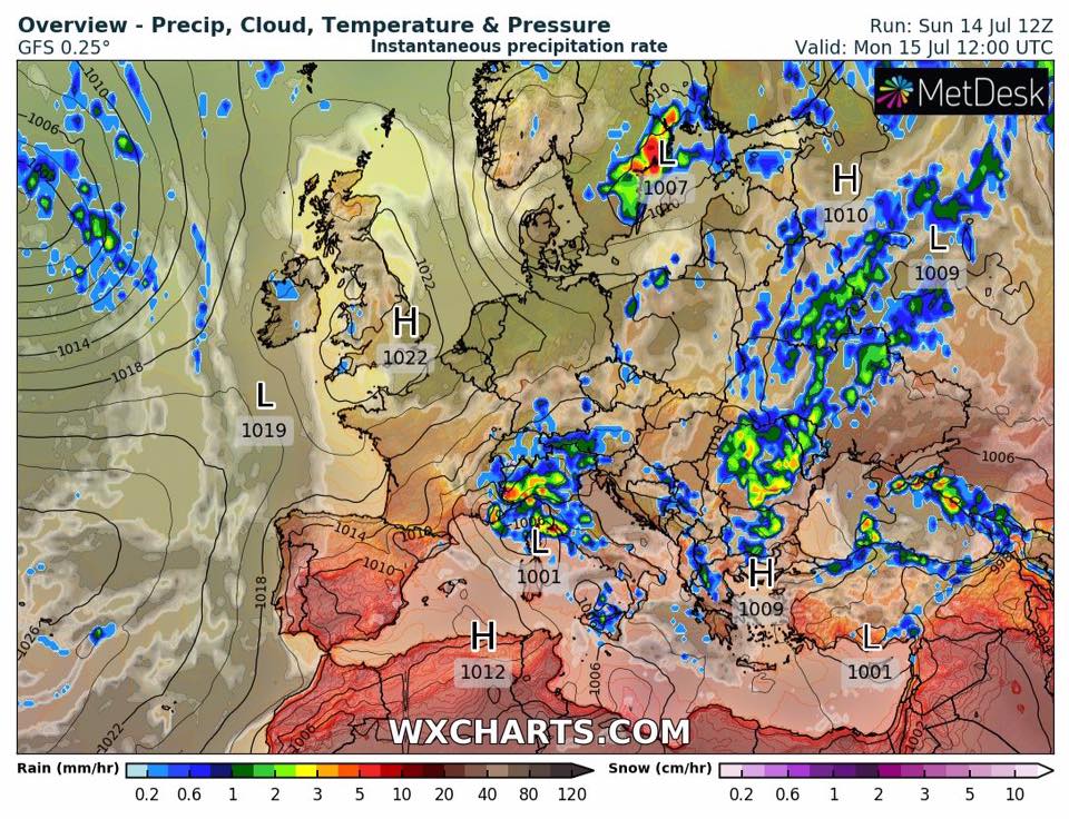 В понедельник ливни и грозы, вероятно со шквалами, ожидаются в правобережной части Украины.