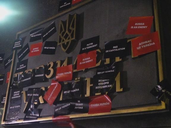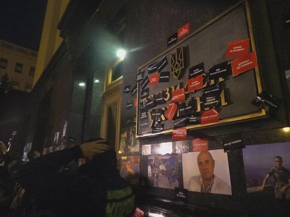 После завершения вече на Майдане, его участники выдвинулись на Банковую к Офису президента. Там люди также скандировали лозунги, здание ОПУ обклеили листовками против капитуляции, выборов в ОРДЛО, формулы Штайнмайера.